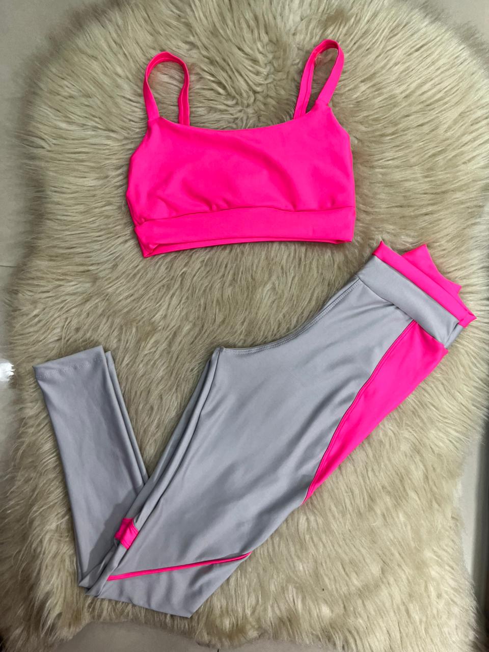 Conjunto Legging Vivo+Top Alça Reta Cor Prata+Rosa Neon