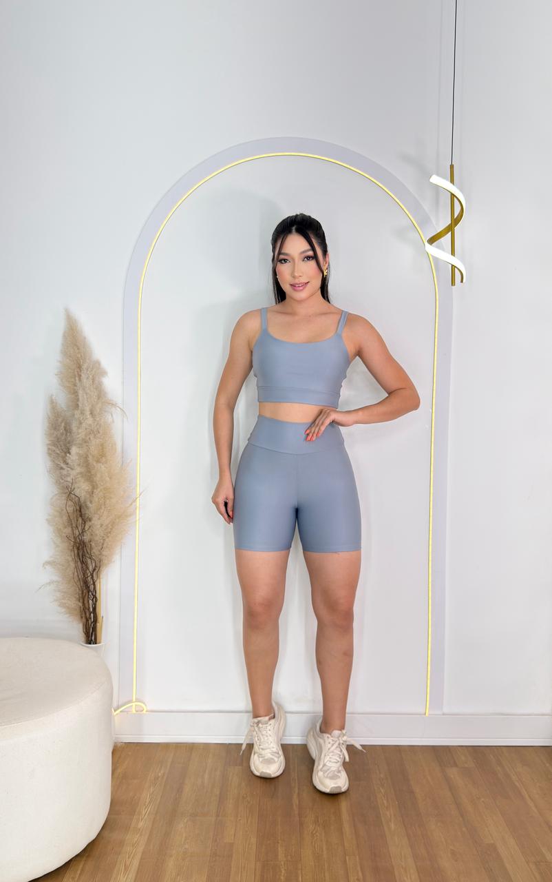 Conjunto Short Meia Coxa+ Top Alça Reta Cor Cinza Claro